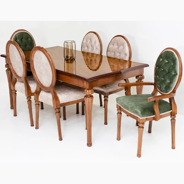 The table is paired with six beautifully curved chairs, featuring soft velvet backrests and seats for maximum comfort. The mix of neutral and deep green tones enhances the aesthetic while maintaining a classic harmony.